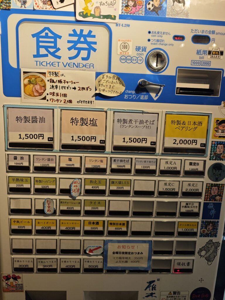 食券制で現金のみなので注意。購入ラーメンは「醤油」「塩」「煮干し油そば」の3種あり。