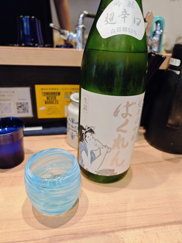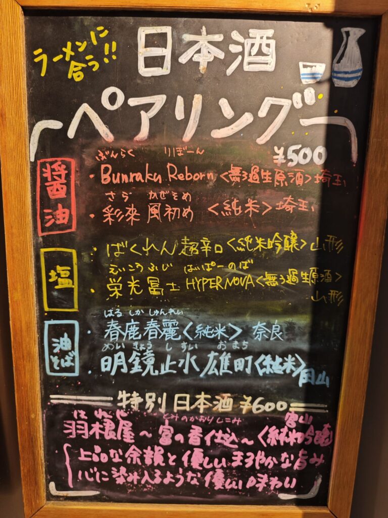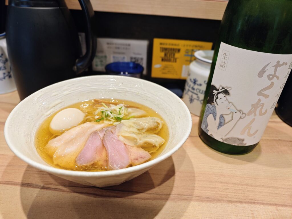 ラーメンは「特製塩」、塩とおすすめのペアリングとのことで日本酒は「ばくれん 超辛口純米吟醸」にしました。