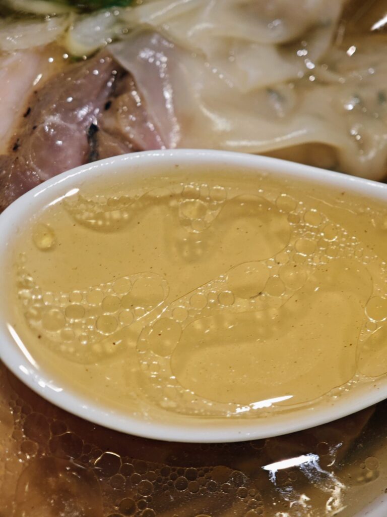 澄み渡ったクリアーで凛とした佇まいの清湯スープがなんとも美しい。眺めていると吸い込まれそう!