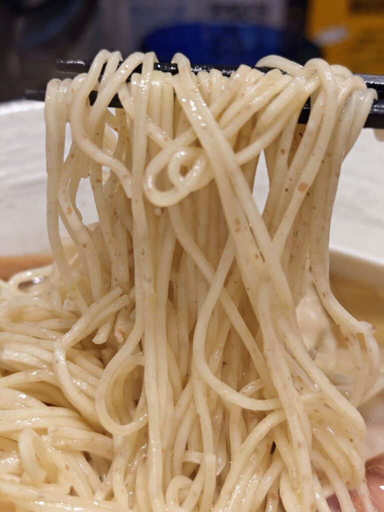 麺は全粒粉を使ったストレート細麺でしなやかな食感と滑らかな麺肌でスルスルと喉を通っていきますね。