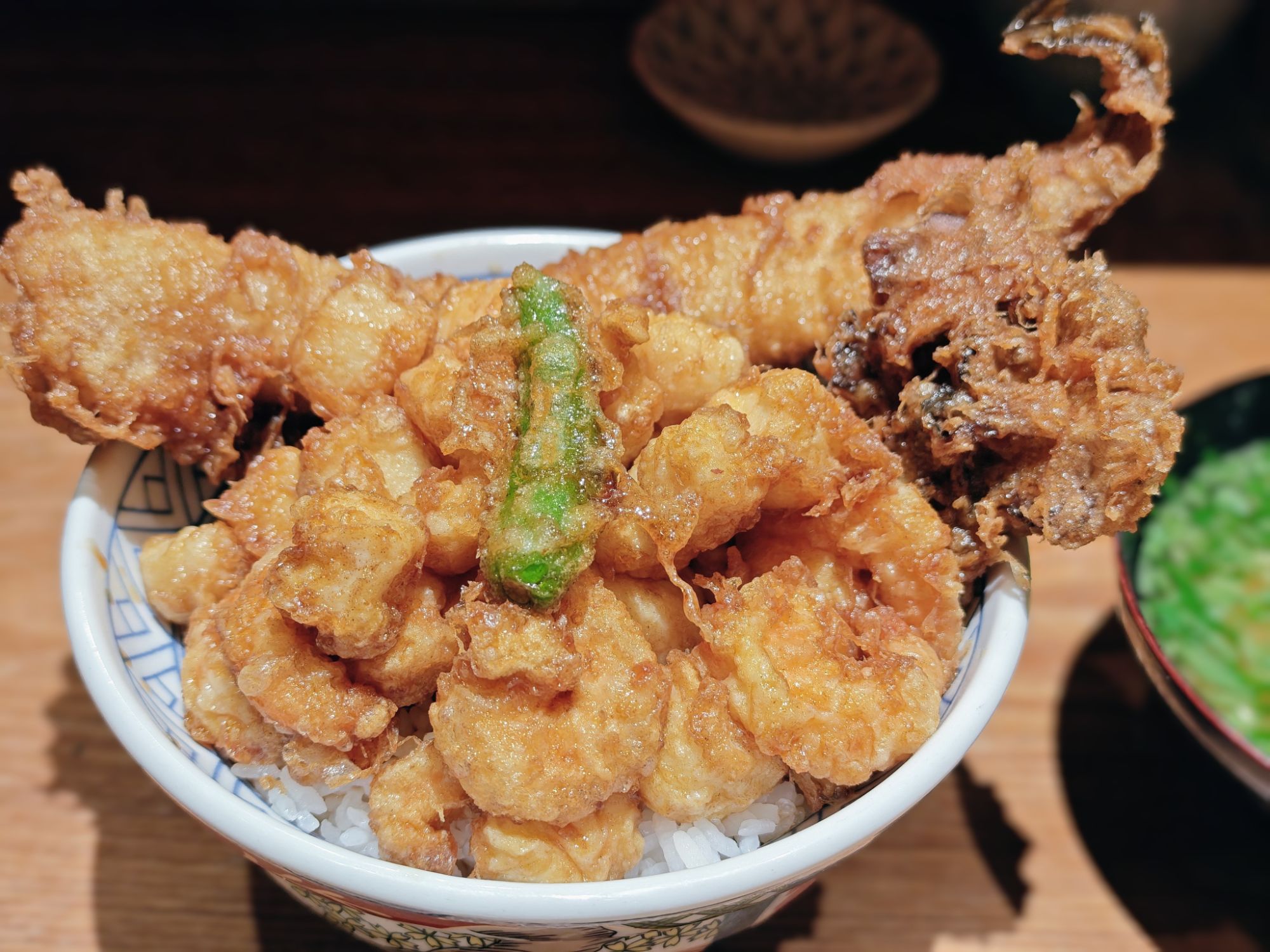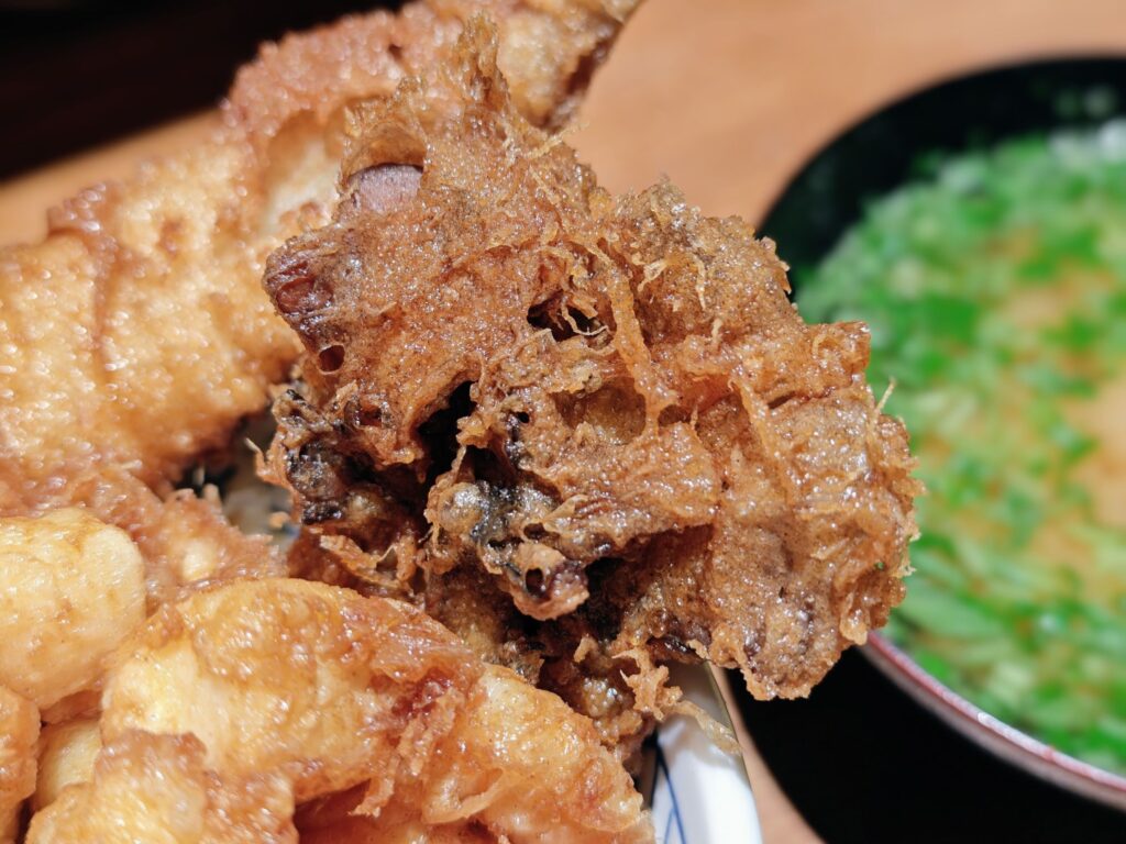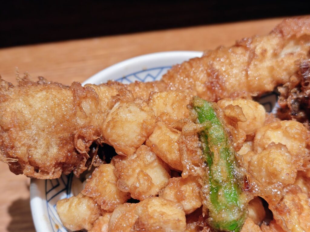 さっそくガブッと食べてみると、、、まず穴子と舞茸に関しては「しっかり目」に揚げてあります。衣はバリッとしっててクランチー寄り、ディープフライに近い食感。具材の水分を比較的飛ばしているように感じました。