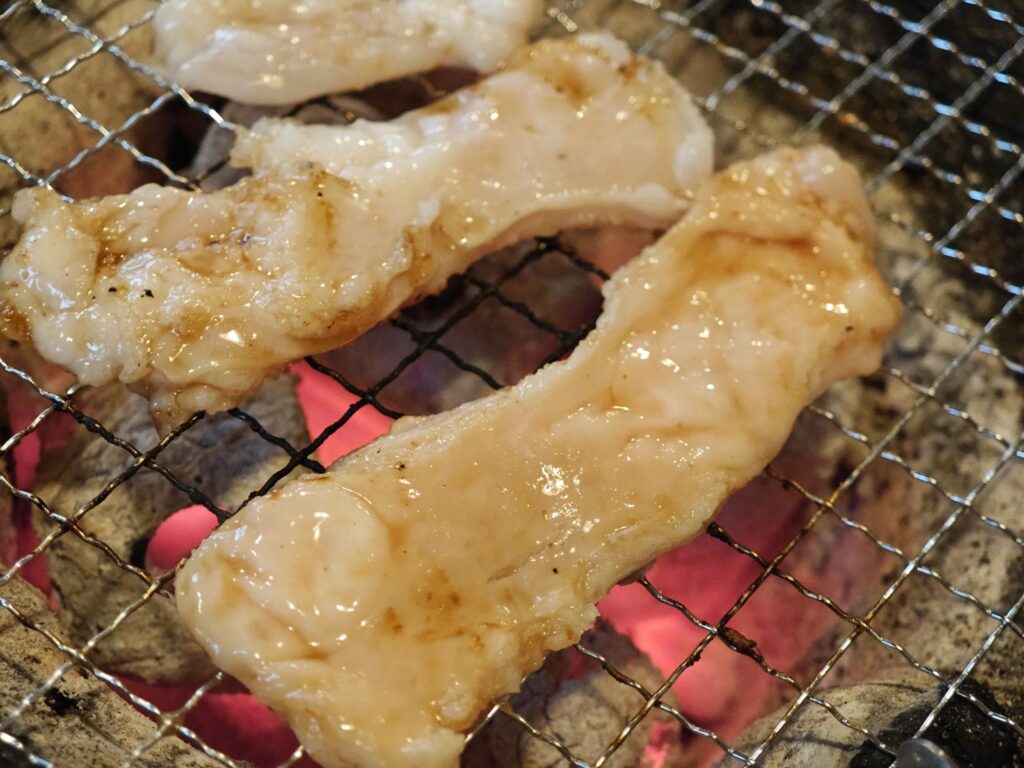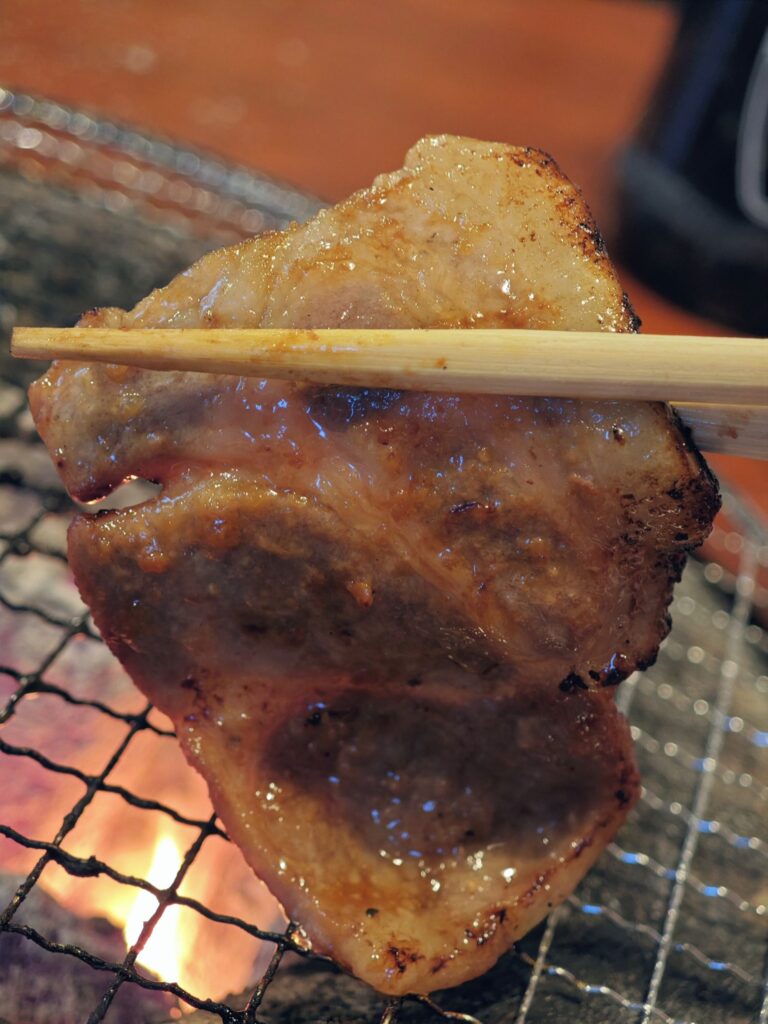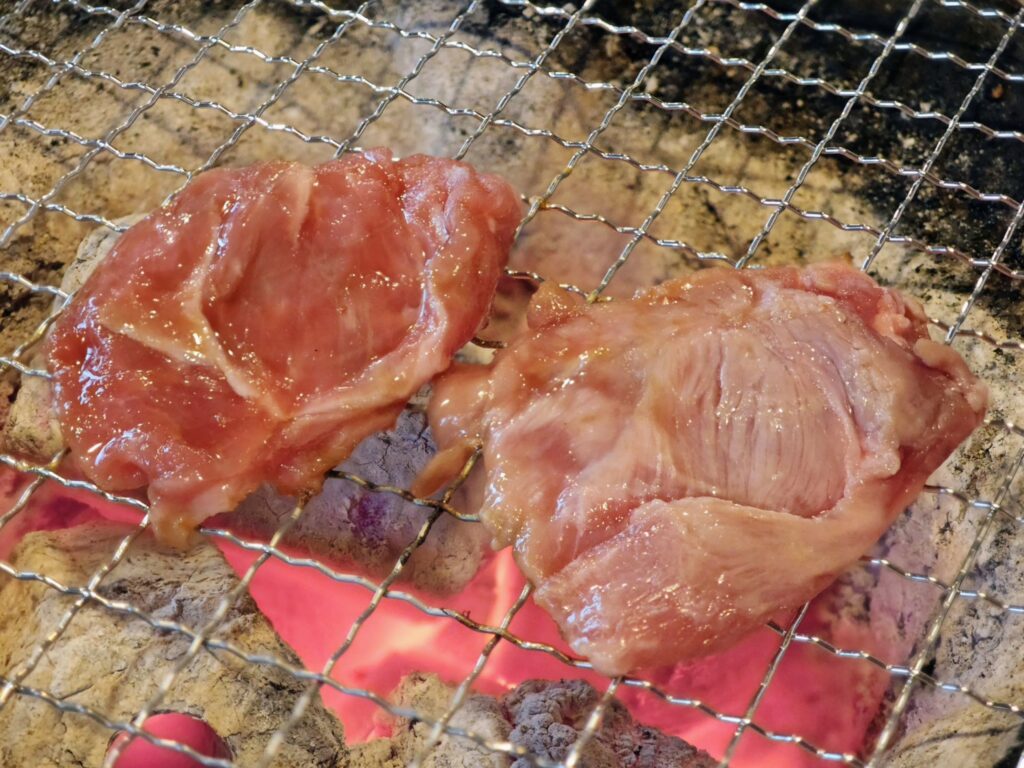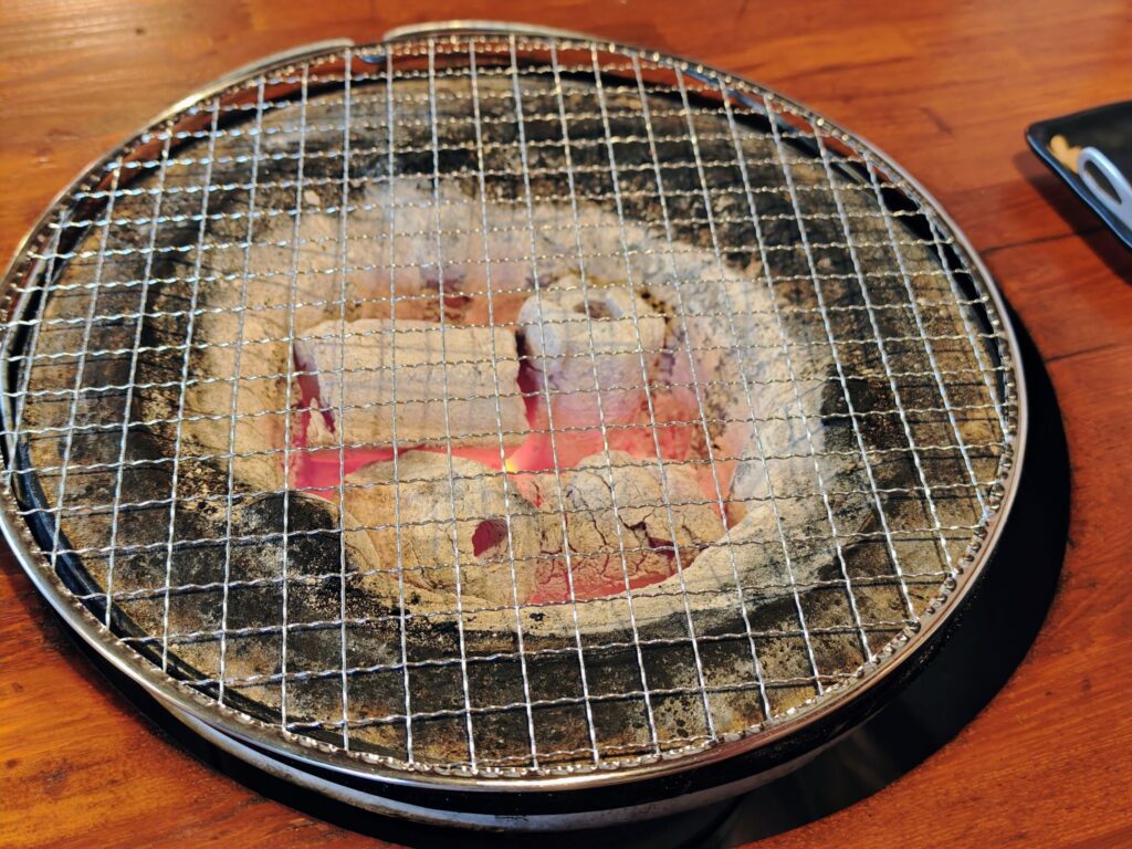 入店するとテーブルのくぼみに炭を入れた七輪がセットされます。炭がたっぷり入ってて火源が網の近くにあるので肉が焼けるのがかなり早くて快適でした。