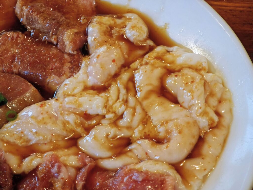 まずはシロ(大腸)から。「ぷるん」としたゼラチン質と「クニクニ」とした弾力感がひとつ屋根の下に同居しているような食感。
