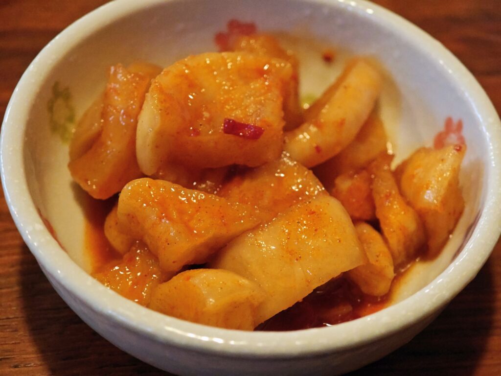 乳酸発酵の酸味感は控えめ、ストレートにピリッとした辛味が伝わってくる浅漬かりなカクテキ。ボリボリとした大根の強い歯ごたえもあり美味しいです。