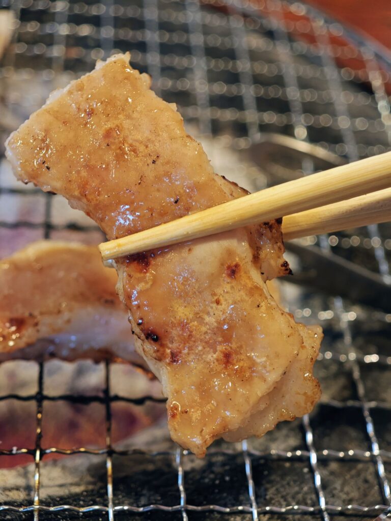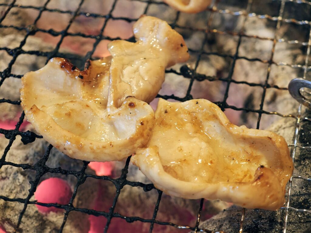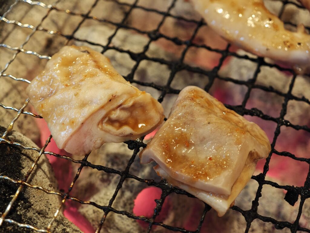 つづいて「豚トロ」。炭火で表面がカリッと焼き上がります。甘い脂とジューシーさにウットリ。