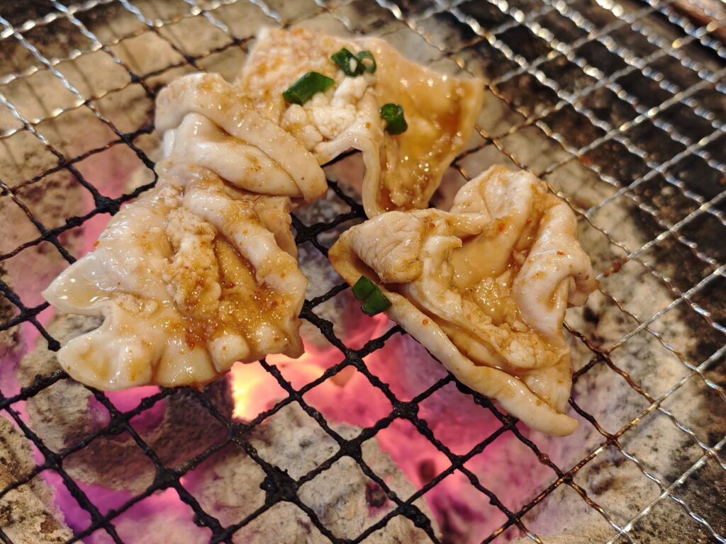 七輪焼きのホルモンはとても雰囲気があって良いですが、爆ぜた炭の白い粉が多少舞うのはやむを得ないですね。