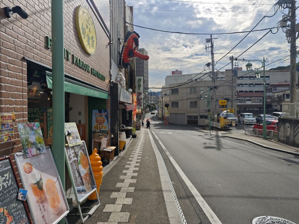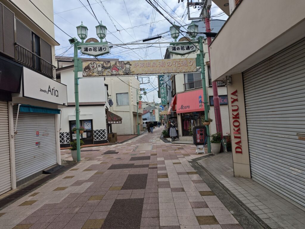 駅前のトータリーから「湯の花通り」に入り南下します。この通りはお土産屋さんが多いので観光で伊東に来た方はここで買い物をするのも良さそう。