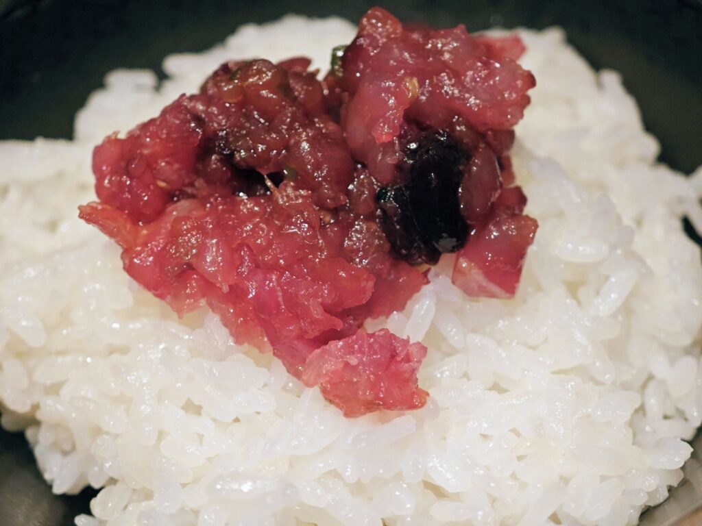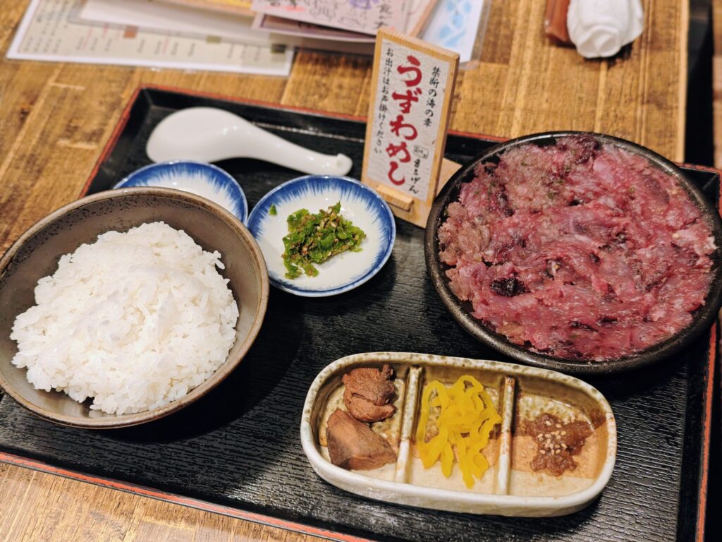 『まるげん/まるたか』さんの公式HPによると「うずわ」は宗田鰹の静岡県東部地方での呼び方で、漁師の間で食べられていたのが「うずわ飯」らしい。雰囲気としては宗田鰹をたたいてネギなどの薬味とまぜこんだ「なめろう」に近い料理ですね。