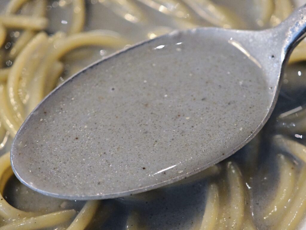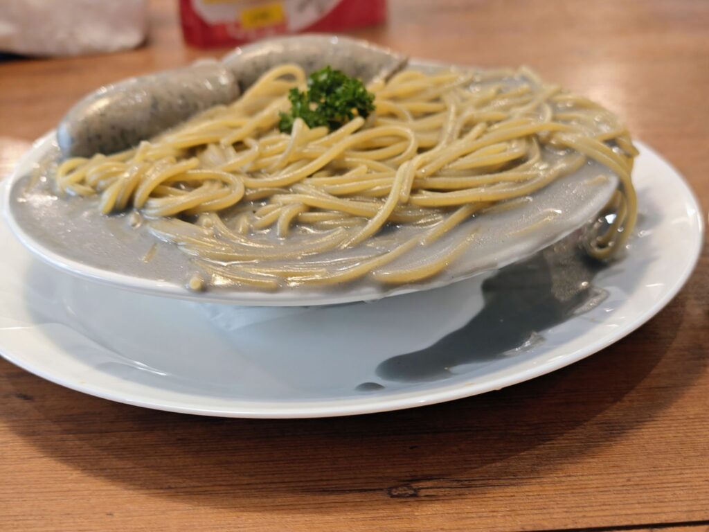 まるでラーメンのような溢れんばかりのスープに太めのパスタ…そしてセメント色の煮干しスープという衝撃的なビジュアル。