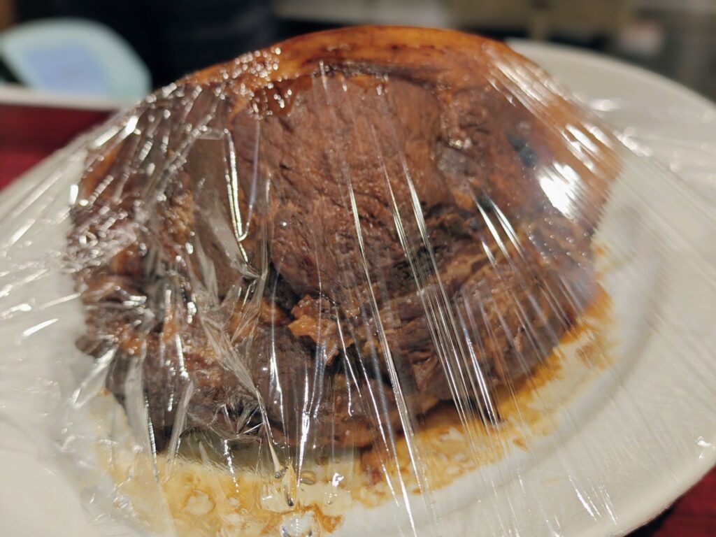 カウンター席の上にはラップにくるまれた巨大なチャーシューの塊が。