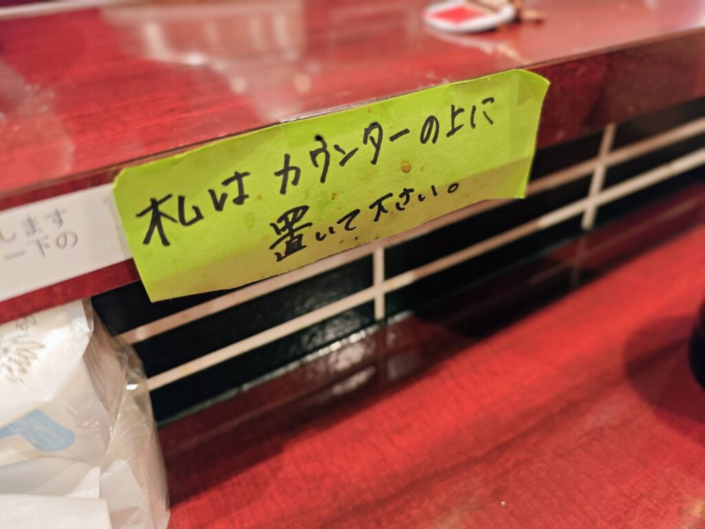 開店時刻になると入店して今度は入口で飲み物の注文を聞かれます。飲み物はセルフ式で客が自分で冷蔵庫から取ってくるシステムでした。説明書きどおり料理のメニュー札はカウンター席の上へ置きます。