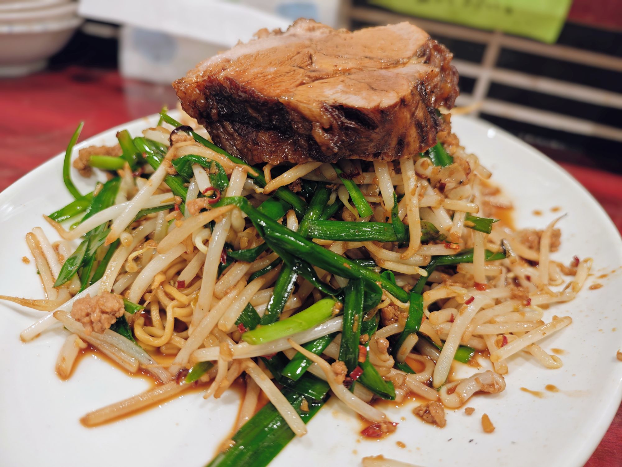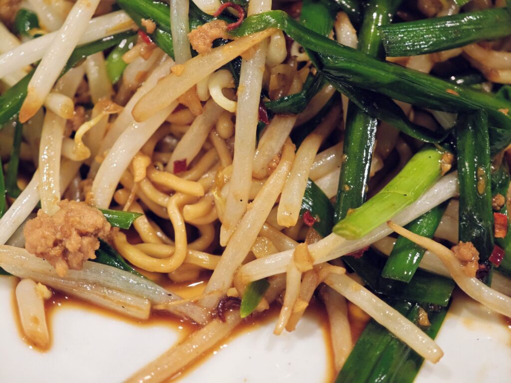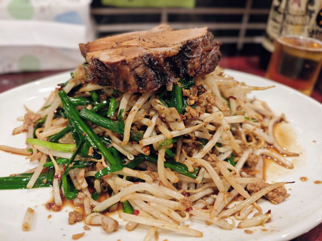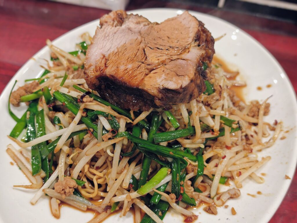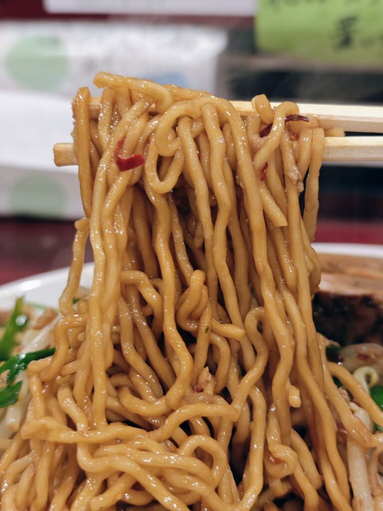 チャーシューとモヤシの下には麺が隠れていました。中細のちぢれ麺となっており中心部にほんのり芯の固さを感じるアルデンテな食感。醤油ベースの甘辛タレが麺によく絡んでいます。