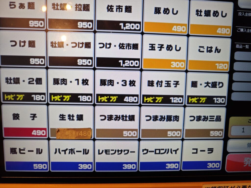 ラーメンは牡蠣スープの「らぁ麺」と「つけ麺」の2種がベースで、いわゆる特製ラーメンの位置づけとなる「佐市麺」「つけ・佐市麺」あり。