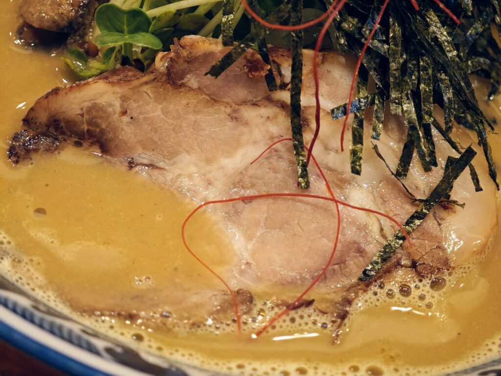 チャーシューはロース肉でした。タレ感のないプレーン寄りな塩味で脂身感が少なく赤身肉のうま味の方が強く出ています。歯ざわりは柔らかく食感良好。
