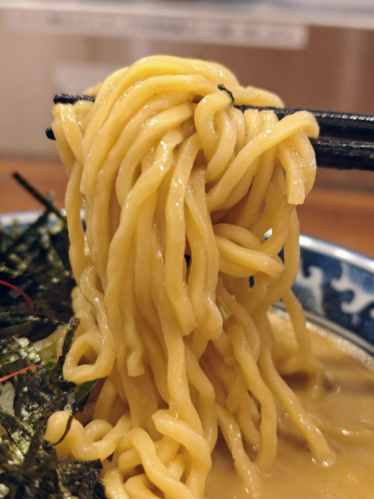 麺は中太のちぢれ麺。不規則にウェーブがかった形状の麺がドロッと粘性のあるスープと非常によく絡む。