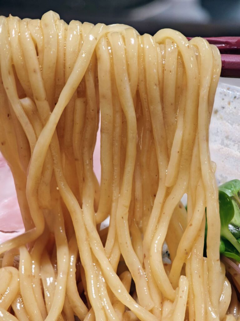 さっそく麺をたぐってひとすすり…麺の食感と同時に魚介の芳醇で豊かな風味がブワッと鼻孔を抜けていく。タレは醤油を中心とした塩気の中にほんのり甘味がある感じ。