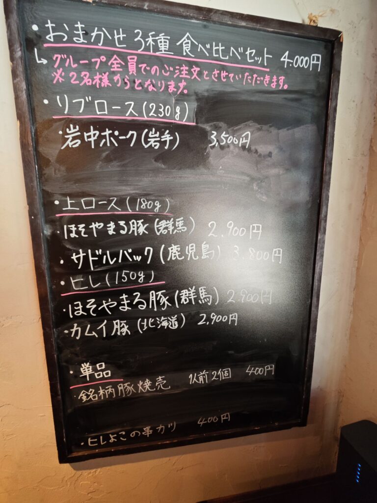 『とんかつの部』の特徴は様々な銘柄豚から好きなモノを選べるところ。この日は岩中ポーク(岩手)、ほそやまる豚(群馬)、サドルバック(鹿児島)、カムイ豚(北海道)のラインナップ。日によって林SPF豚(千葉)なども選べるようです。
