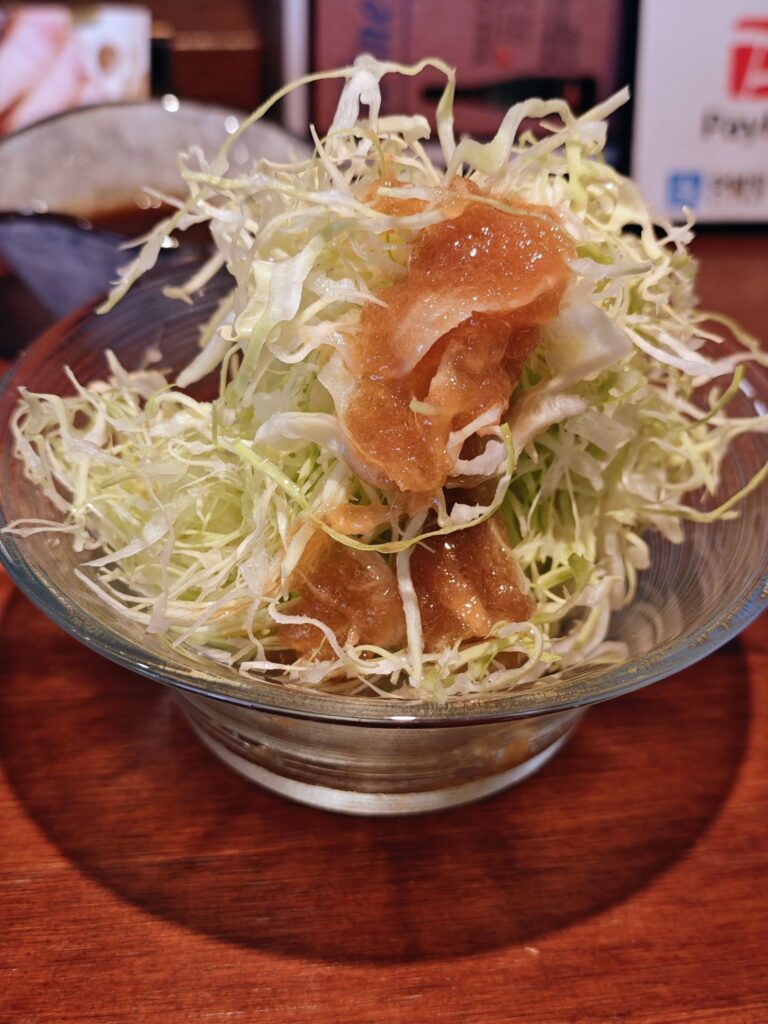 注文するとキャベツ(おかわり可能)が運ばれてきます。ドレッシングが酸味の効いた爽やかなタイプで美味。