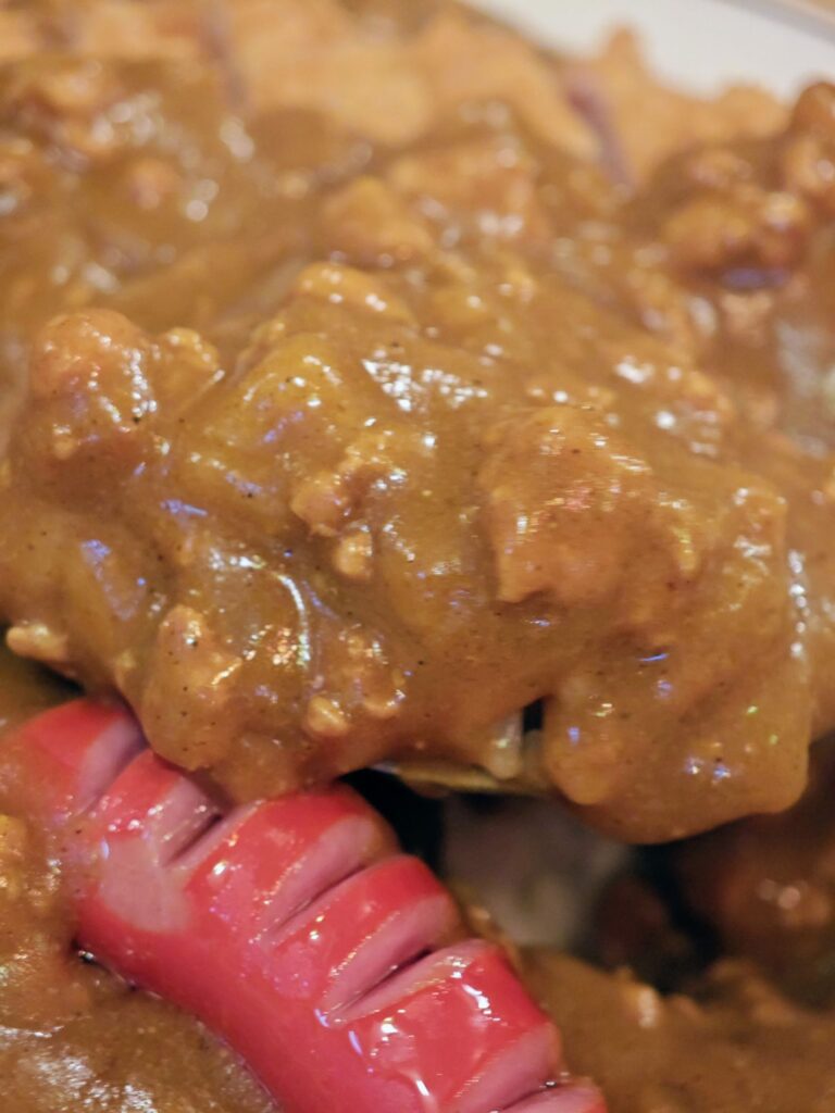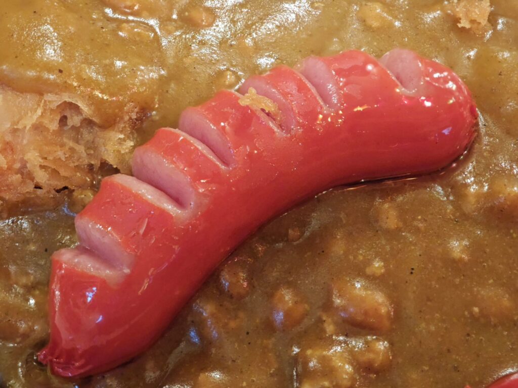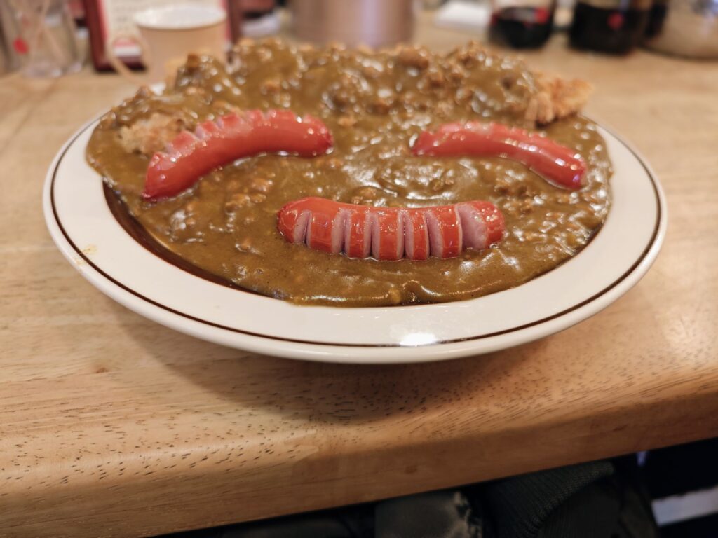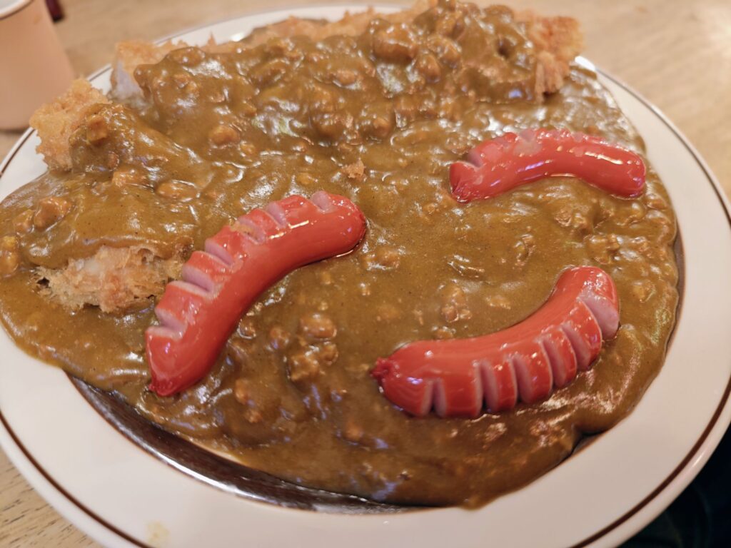 注文したのは「カツウインナーカレー」(中盛り)。メニュー表にはない組み合わせですが快く対応してもらえます。赤ウインナーがニコちゃんマークなのが可愛い(笑)
