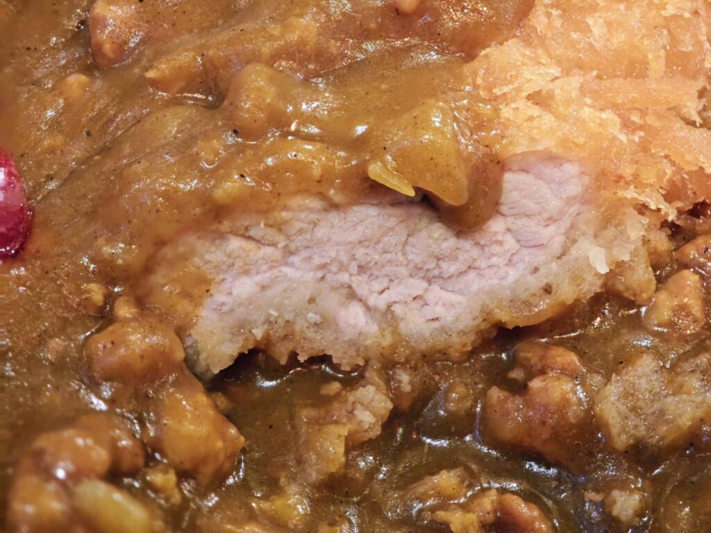 「粗目のパン粉」&「厚めの衣」という組み合わせのカツ。カレールウをよく吸って美味。肉は赤身主体のロースでほんのりロゼ色のレアさも入っておりしっとりとした味わい。カツのクオリティも高いですね。