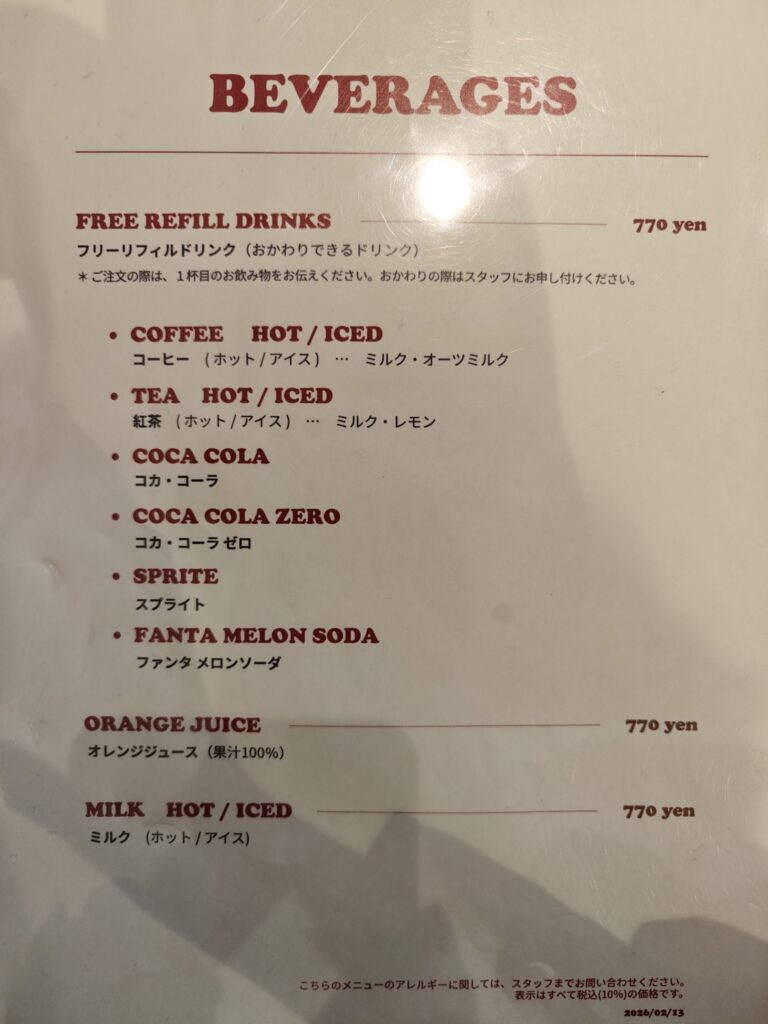 嬉しいのがドリンクがフリーフィル(飲み放題)。コーヒーや紅茶はもちろんのこと、コカ・コーラ、コカ・コーラゼロ、スプライト、ファンタメロンソーダがお代わり自由。