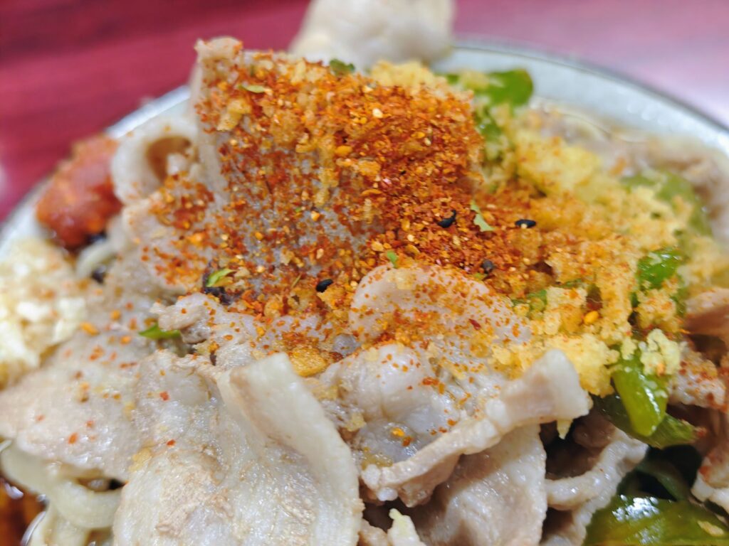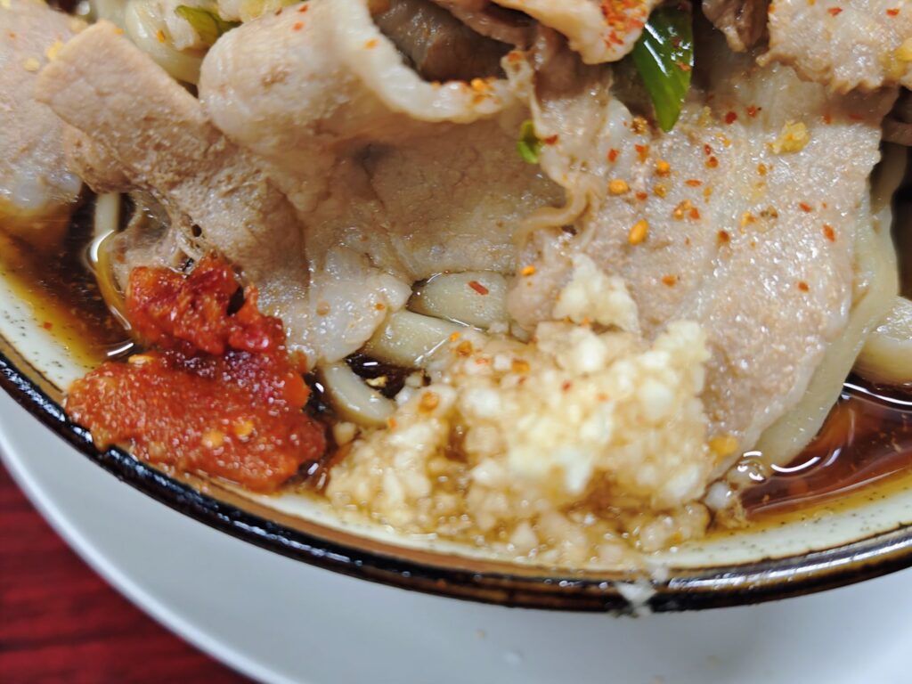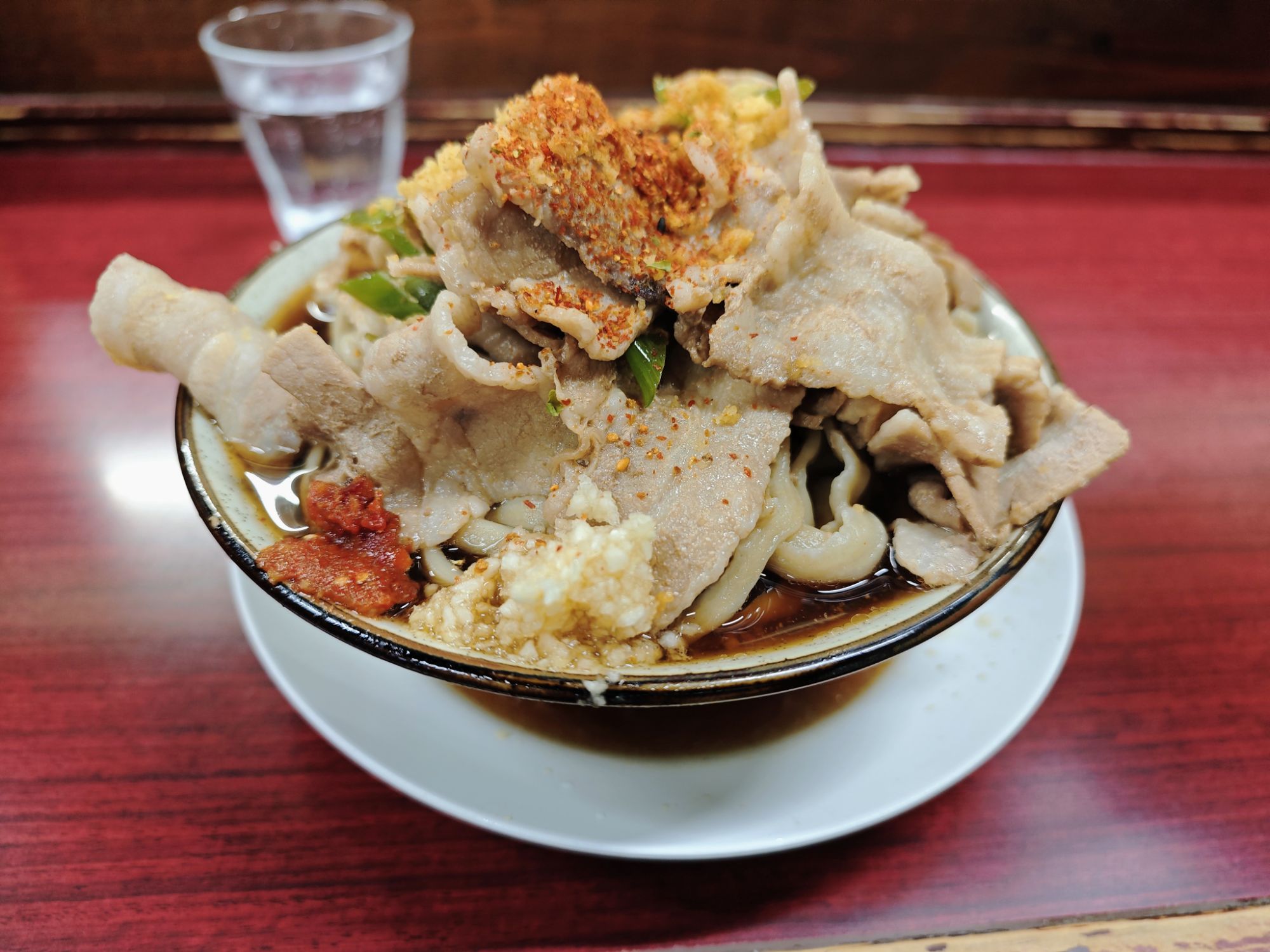 大量の肉と麺をかき分けどうにかレンゲでスープをすくう。どこかキリッとした醤油の塩味(えんみ)に蕎麦ツユを彷彿とさせる出汁成分。それでいて動物性の脂もたっぷり溶け込んでいる端的にいえば「蕎麦に似ているがジャンク感を足した此処にしかない味」。