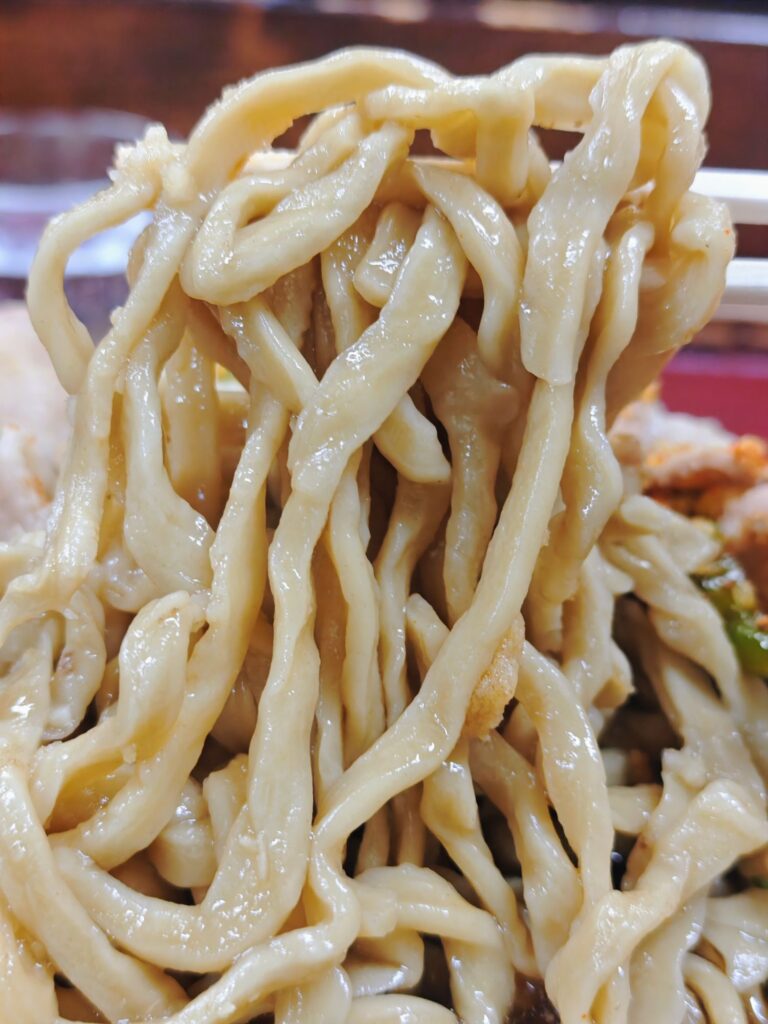麺は極太のちぢれ麺。芯に固さがある力強い食感で各種グルメサイトやSNSで多くの人が言及しているが「ワシワシ系」。