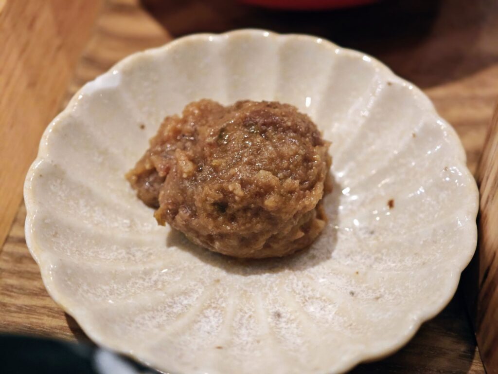 こちらは対照的に肉の水分が火で飛ばされておりドライ寄りな舌ざわり。珍味にも似たコリコリとした食感で咀嚼するとキリッとした塩味(えんみ)を感じられます。意外と麹のまろやかさよりも塩分のシャープさの方が上回っているように感じられます。