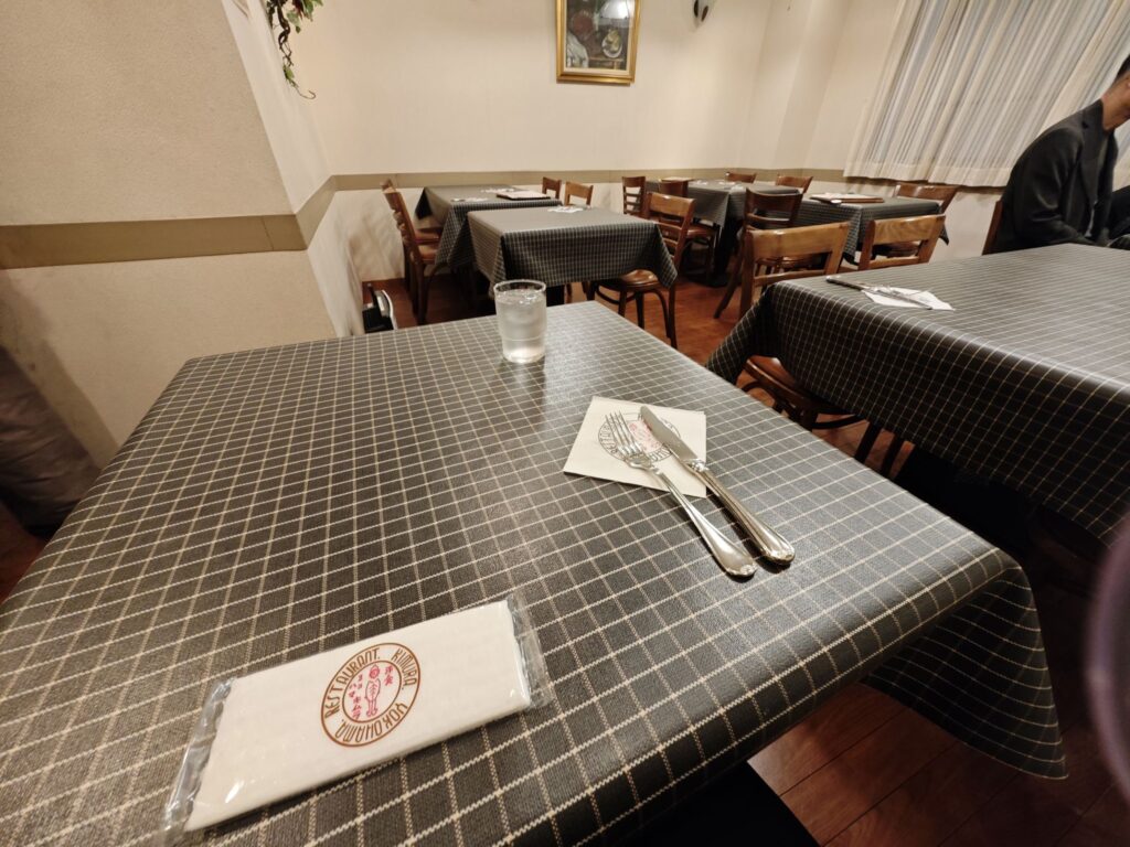 入店するとエレベーターで3階の席に案内されます。白とグレーのチェックのテーブルクロスにカラトリー類が整然と並べられたテーブル。まさに“王道の洋食店”といった雰囲気が食欲を高めてくれますね!