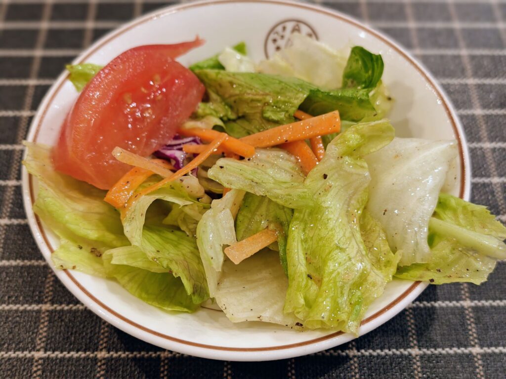 まず運ばれてきたのはプチサラダ。カットしたトマトにニンジン、レタス入り。さっぱりとしたフレンチドレッシングで味付けされています。
