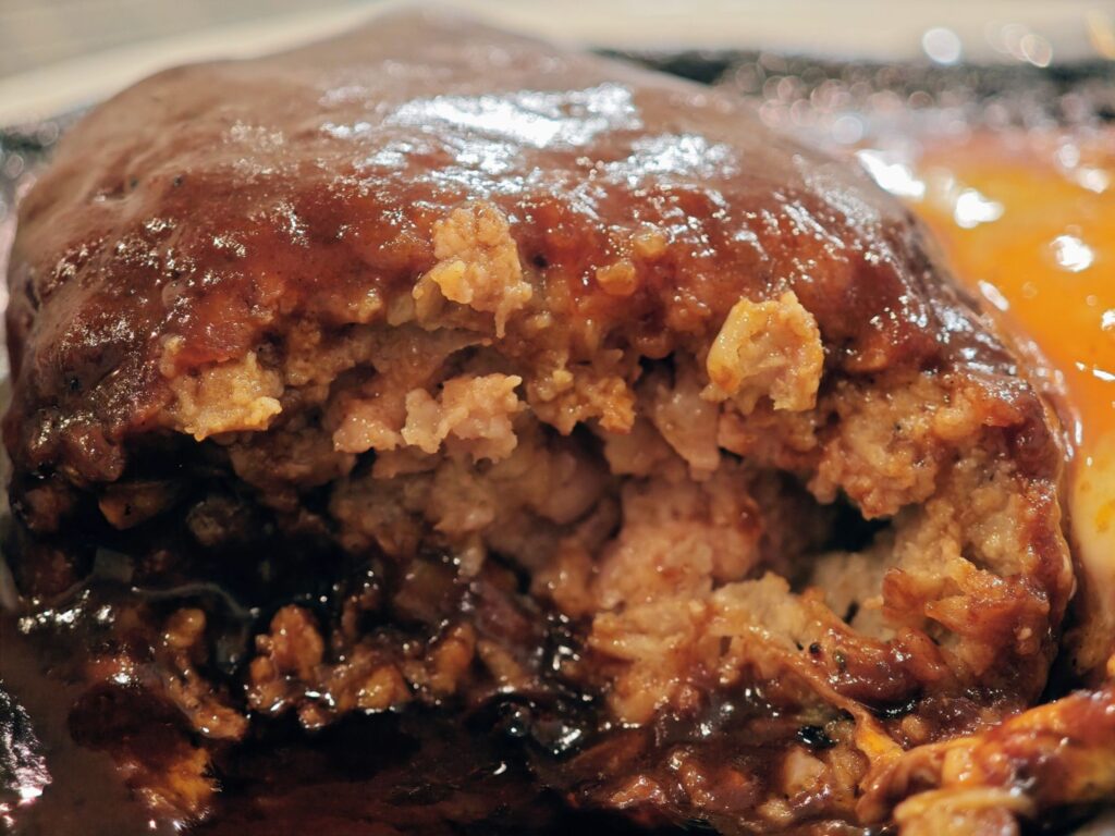 このホワホワな肉質に対して、ハンバーグのタネに練りこんだ粗いみじん切りの玉ねぎのシャキシャキ感が対比的な食感を生み出しています。玉ねぎもじんわりとした優しい甘さも個人的に好きですね。