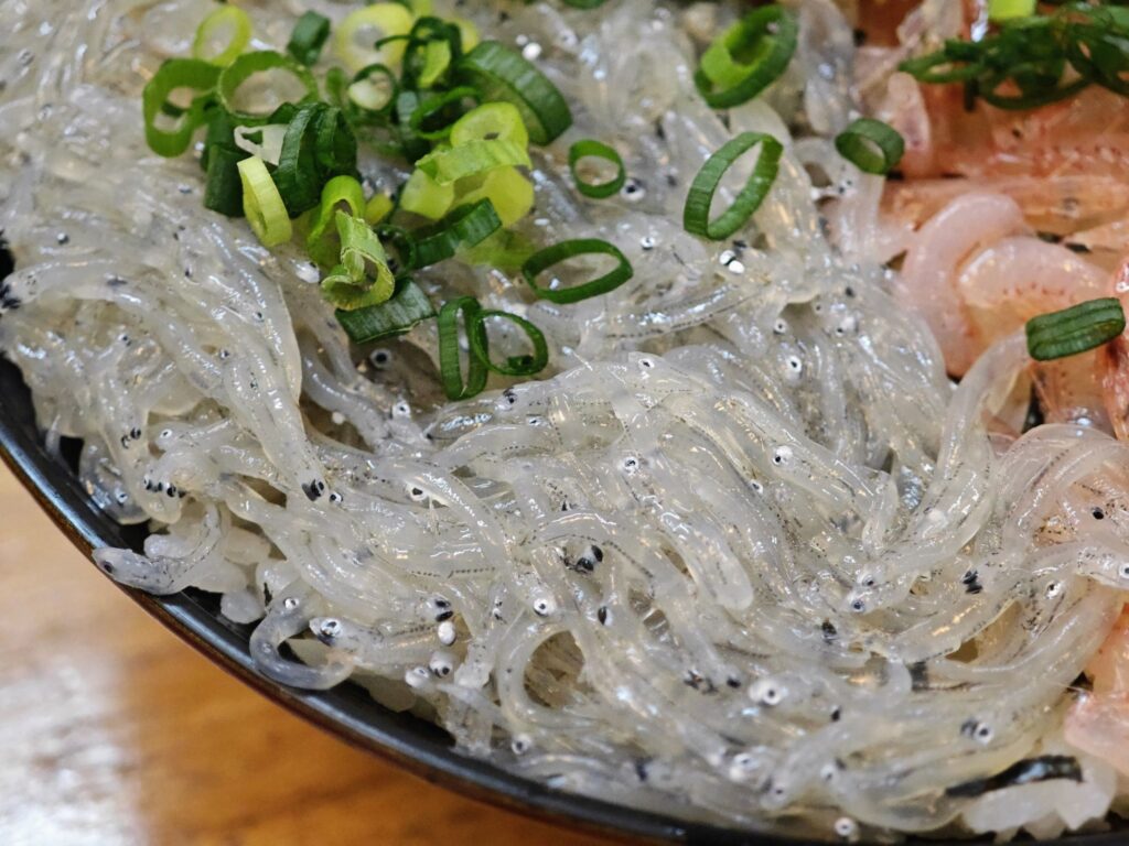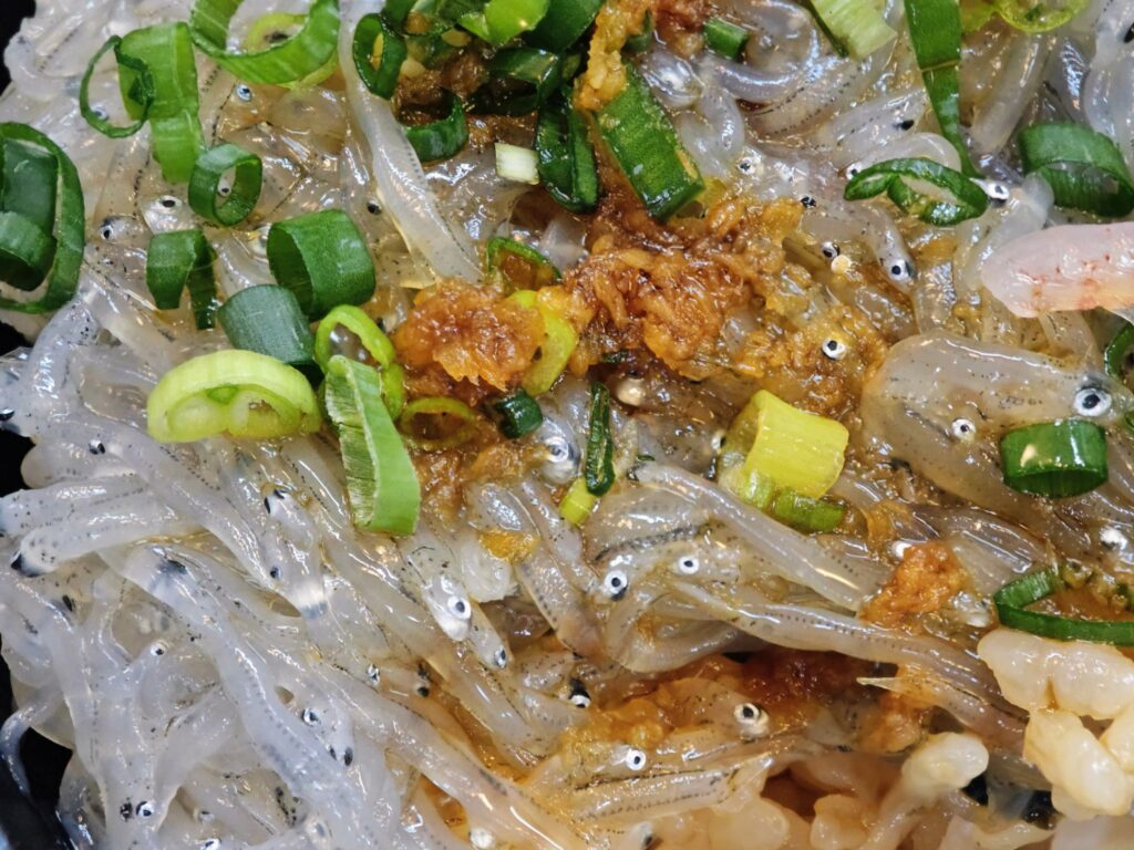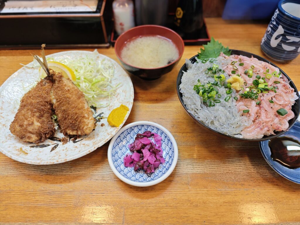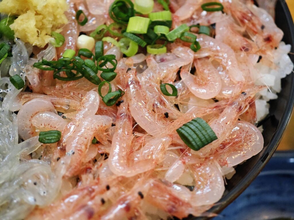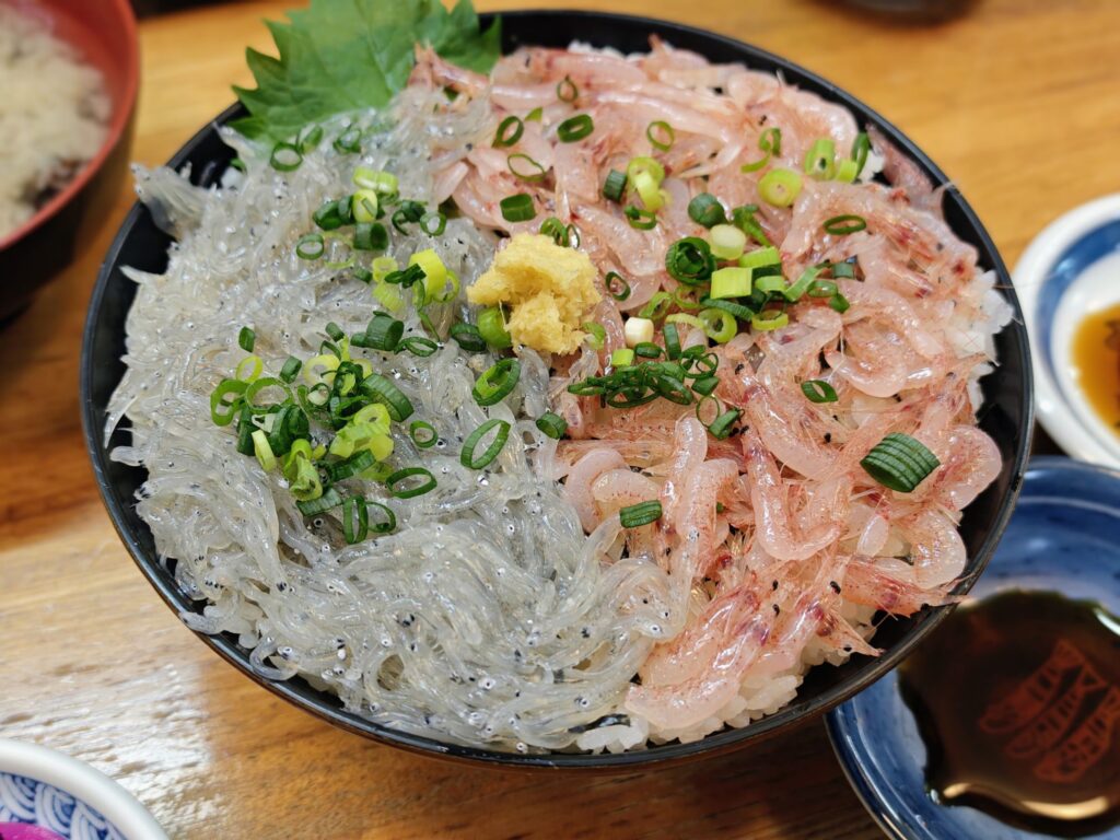 生のシラスと桜エビってどちらも足が早い(腐りやすい)ので、こういう漁港で水揚げされてすぐ提供できる場所でしか味わえない超贅沢な丼ものですよ。