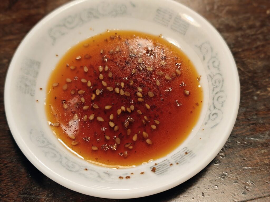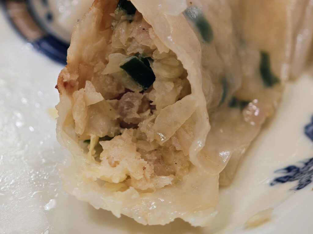 皮は比較的薄め。餡は肉の粒度が細かく全体的にシャリシャリとした食感。ニンニクの辛味は殆ど感じず、代わりに刻んだキャベツの甘味が前面に出てくる優しい味わいです。