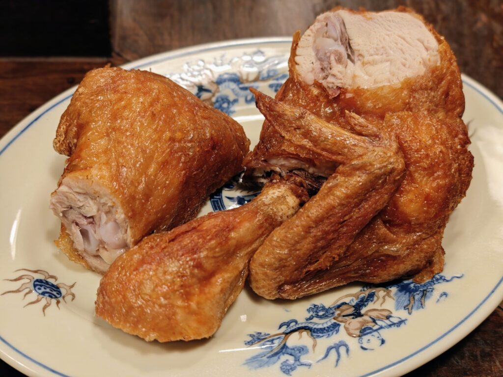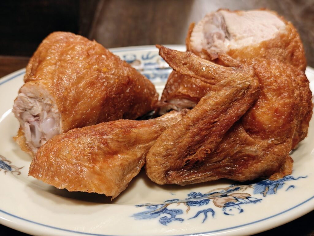『豊亭』名物の唐揚げ。店のお姉さまが大きな寸胴鍋を使って豪快に揚げてらっしゃいました。半身が1人前サイズです。