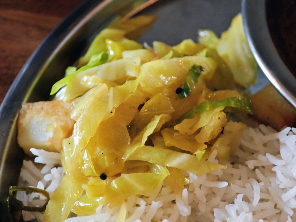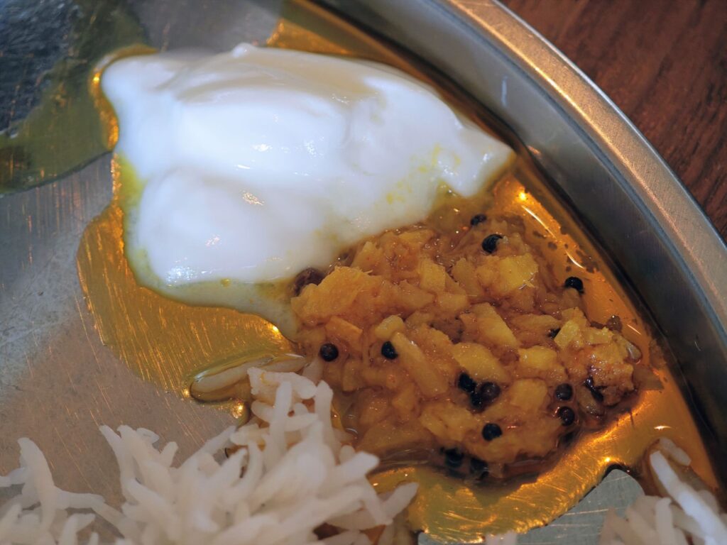 ポリヤルはクローブのホールスパイスが入っておりバチバチとしたエッジが効いた刺激的なスパイス感とキャベツの甘味をあわせもつ。ライタは砂糖不使用でヨーグルトのもつ乳製品特有のコクとマイルドさがストレートに感じられる。