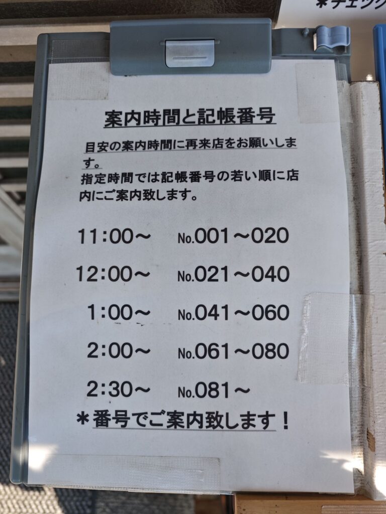 大行列のできる超人気店につき記帳制が導入されており、まず来店して記帳した後にボードに記載された自分の目安時間に再来店して並び直すシステムです。