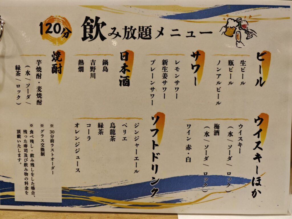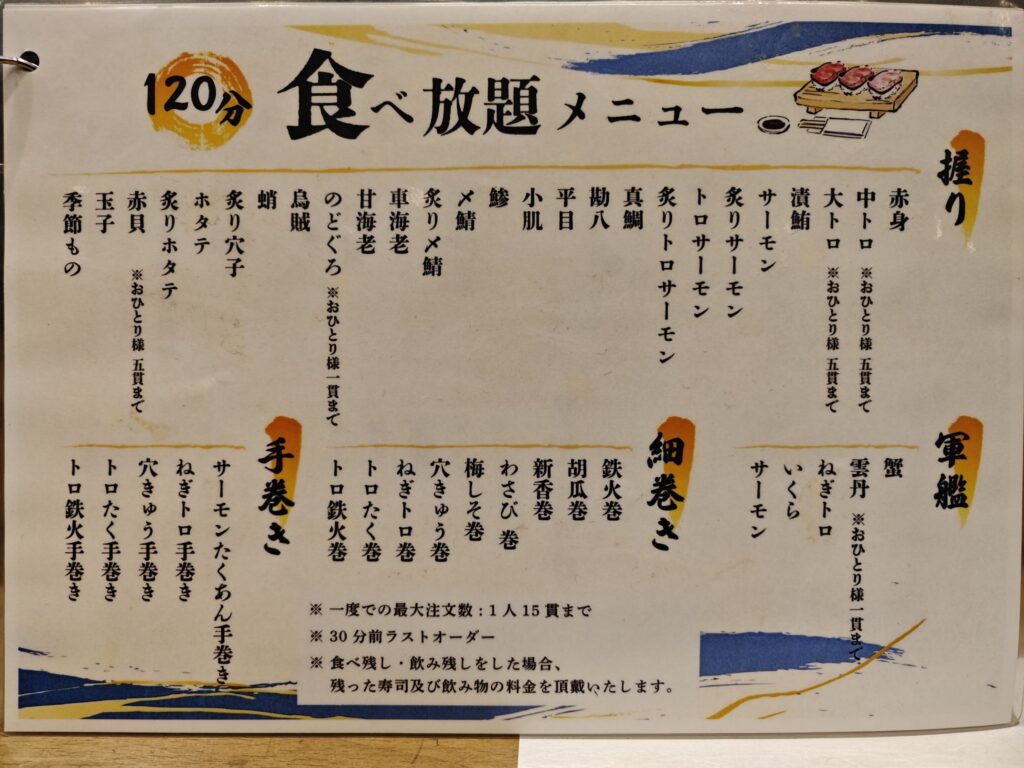 中トロや大トロ、雲丹、のどぐろ等一部のネタは個数制限があります。寿司の食べ残しや飲み残しは別途料金が請求されるので注意。