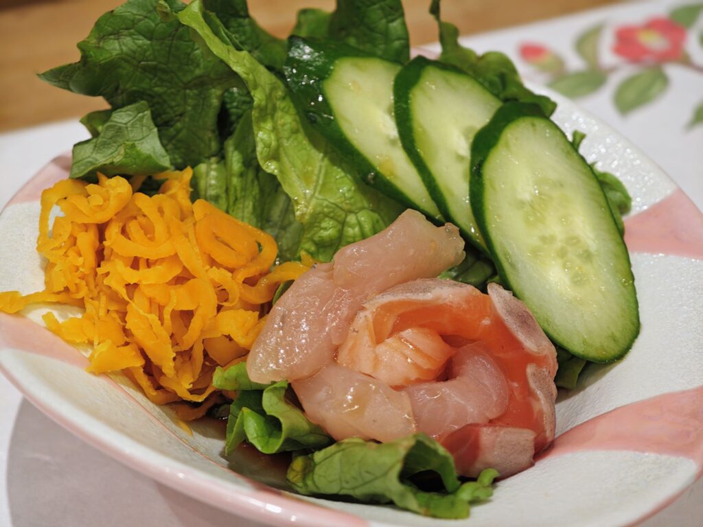 着席して店員様からコース内容の説明を受けた後で「海鮮サラダ」がやって来ました。刺身・レタス・キュウリ・壷漬けが入っています。