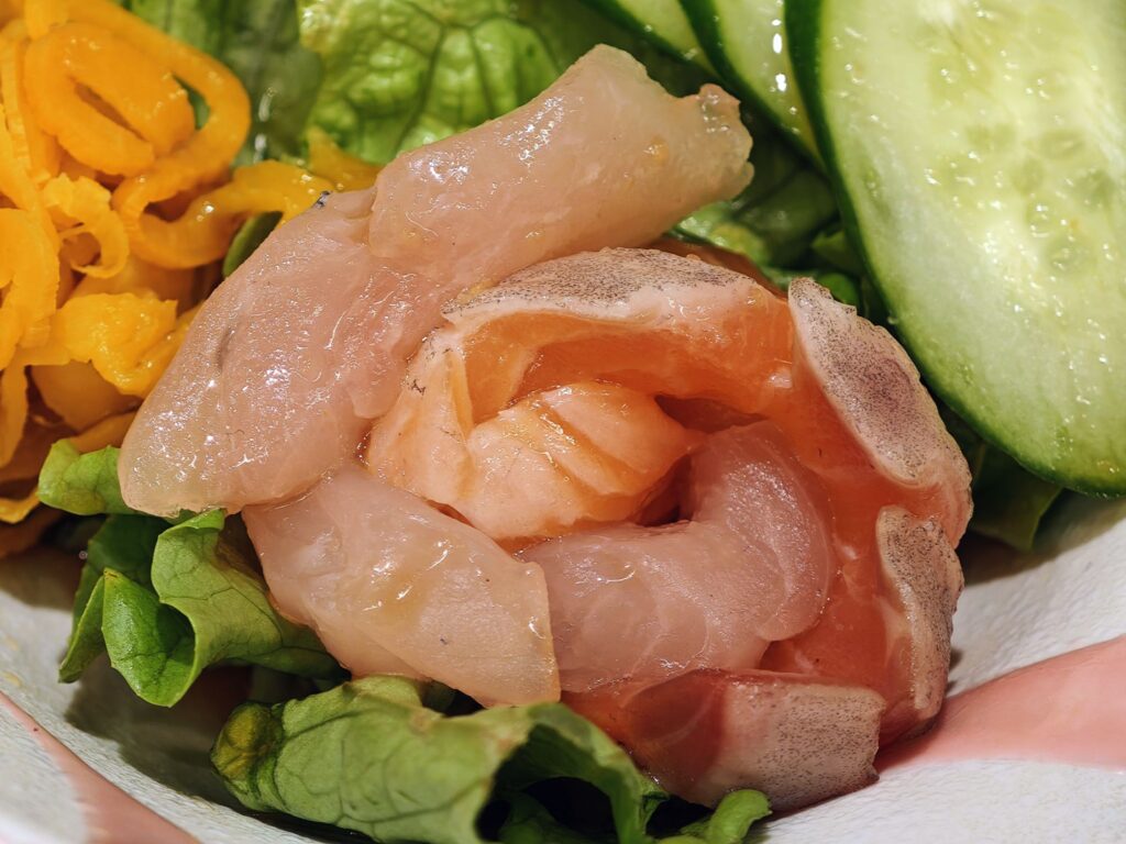 刺身にはサーモンとサワラが使われています。カルパッチョ風に少しオイリーなドレッシングに絡めてあります。トロトロと柔らかな舌ざわりで美味。