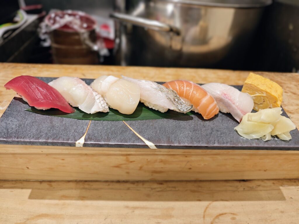 左から順にマグロ赤身・真鯛・帆立・平目・サーモン・カンパチ・玉子。