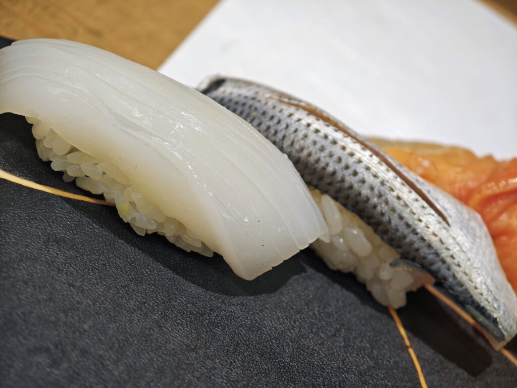 「イカ」は丁寧に隠し包丁が入れてあり口にいれるとハラリとほどける。シコシコした固さとネットリ感、甘味があり大変美味。「小肌」はジューシーな身肉と口をキュッとすぼめたくなる爽やかな酸味感が同居。