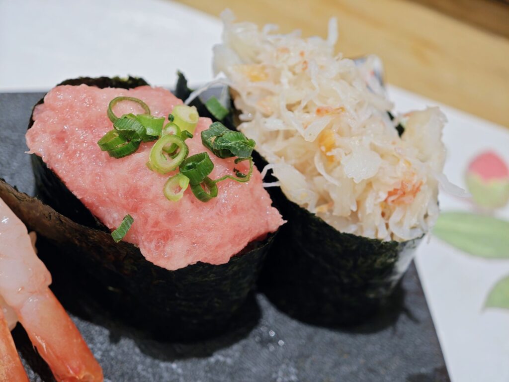 「ねぎとろ」と「蟹」の軍艦巻き近影。